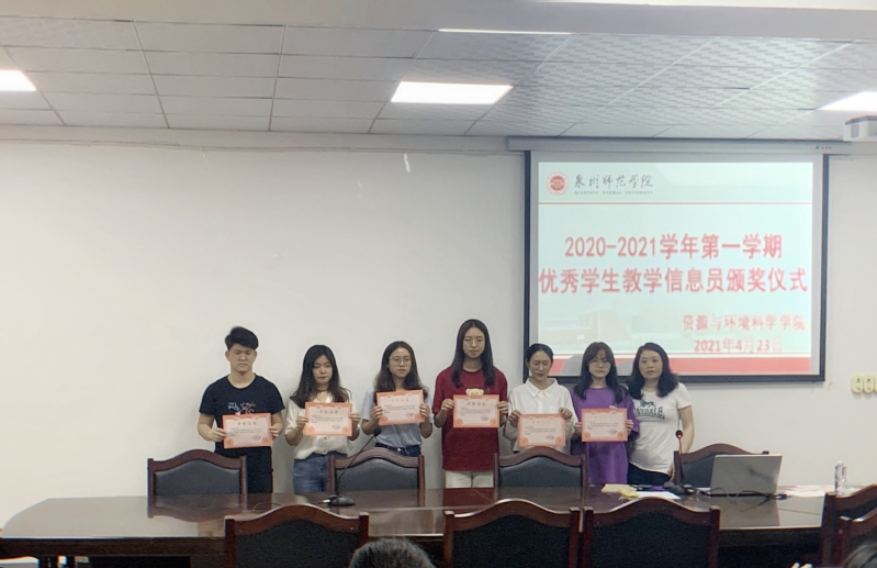 首先,会议进行了2020-2021学年第一学期优秀学生教学信息员颁奖仪式。院教研办主任为获奖的优秀教学信息员颁奖,并合影留念。颁奖仪式上,曹老师对教学信息员的工作表示了充分肯定,并鼓励大家再接再厉,积极进取,发扬资环学院学生干部的优良传统,继续为学院作出更大的贡献。