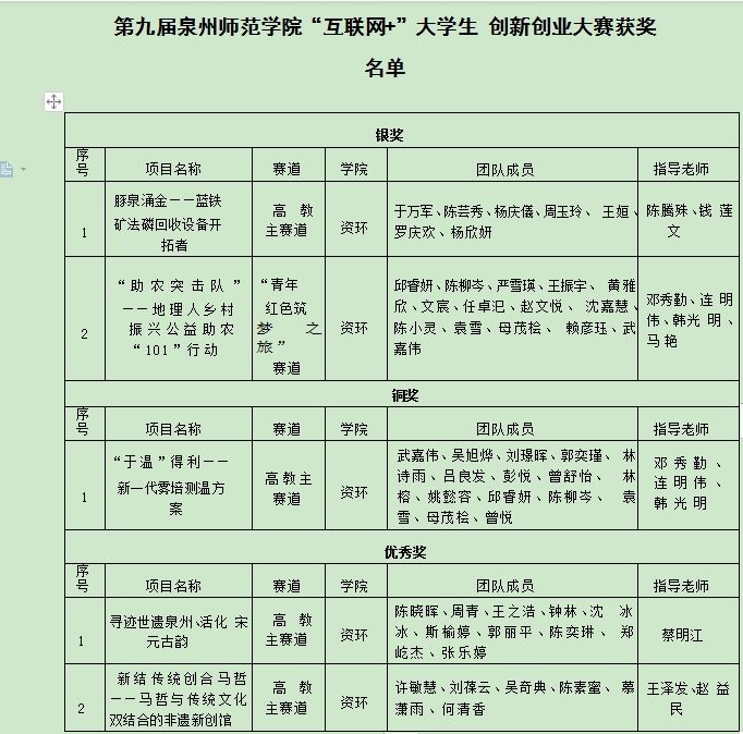 根据《关于公布第九届英国威廉希尔公司官网“第九届英国威廉希尔公司官网“互联网+”大学生创新创业大赛”获奖名单的通知》,我院共有5个项目获奖,其中银奖2项、铜奖1项、优秀奖2项。同时,学院在此次比赛中荣获优秀组织奖,邓秀勤、陈腾殊老师荣获“优秀指导教师”称号。