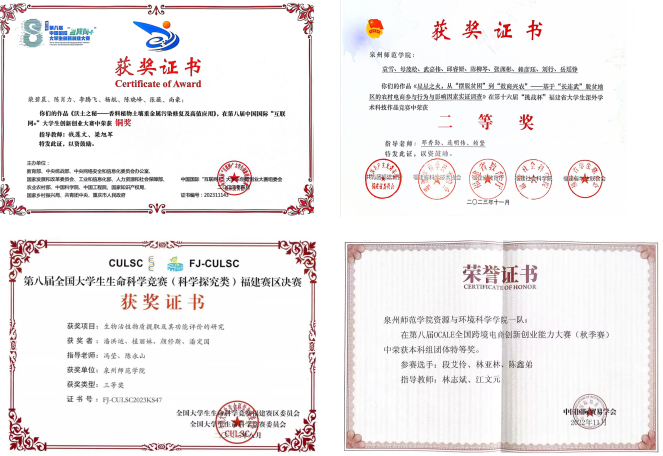 本届学生多次在省级以上专业竞赛中获奖,先后荣获第八届中国国际“互联网+”大学生创新创业大赛铜奖,第十八届“挑战杯”全国大学生课外学术科技作品竞赛二等奖,第十届全国科学教育专业师范生教学技能创新大赛三等奖,第九届全国大学生能源经济学术创意大赛三等奖,第十六届全国大学生节能减排社会实践与科技竞赛三等奖,第八届全国大学生生命科学竞赛三等奖,2023年全国研学课程设计大赛一等奖,第八届OCALE全国跨境电商创新创业能力大赛特等奖等奖项。