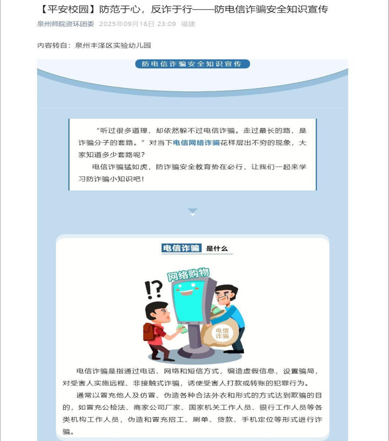 为深入贯彻落实《福建省教育厅关于印发福建省2025年秋季开学季防范电信网络诈骗宣传月工作方案的通知》文件精神,资源与环境科学学院于9月7日至9月25日,以“青春无诈、开学慧防”为主题,集中组织开展了防范电信网络诈骗宣传月活动。学院积极拓展宣传渠道,创新活动形式,组织开展了一系列内容丰富的防诈宣传教育活动,全面提升师生防诈意识和能力。