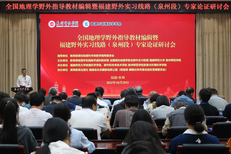 10月29日至31日,全国地理学野外指导教材编辑暨福建野外实习线路(泉州段)专家论证研讨会在我校召开。此次会议由我校联合教育部地理学实践教学虚拟教研室、全国高校地理学联合野外实习联盟、福建师范大学主办。华东师范大学原校长俞立中、西安石油大学原党委书记惠泱河、教育部高校地理科学类教学指导委员会原副主任郑祥民、哈尔滨师范大学原副校长臧淑英、贵州师范大学原副校长杨胜天、中国地理学会原副理事长吴正方等来自全国20余所高校近50名专家参加。副校长黄江昆出席研讨会并致辞。