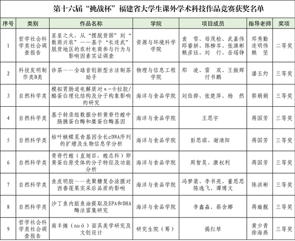 据悉,“挑战杯”福建省大学生课外学术科技作品竞赛是我省大学生科技创新活动的重要内容,竞赛每两年举办一届,从1992年开展至今已是第十六届,是我省大学生课外学术科技活动中一项具有导向性、示范性和群众性的竞赛活动。本届大赛由团省委、省科协、省教育厅、省社科院、省学联联合主办,福建农林大学、共青团福州市委共同承办,共评出特等奖25件、一等奖50件、二等奖123件、三等奖302件。(校团委)