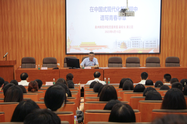 6月8日下午,副校长黄江昆在南安校区黄仲咸学术报告厅以《在中国式现代化新征程中谱写青春华章》为题,为南安学院师生讲授主题教育专题党课,南安学院党政负责人、全体师生党员、入党积极分子等参加学习。