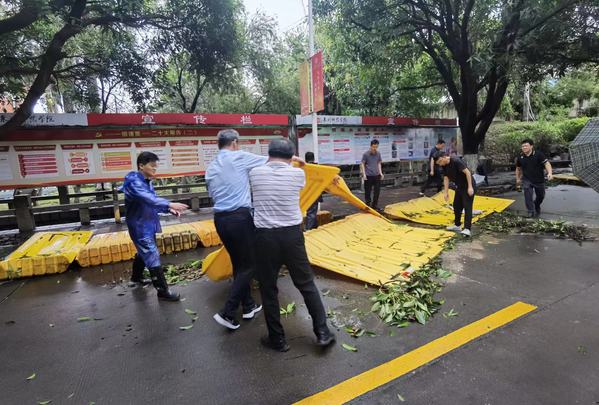第一时间赶赴现场。狂风暴雨造成校园内树木倒伏,路面积水,党员突击队队员们全力出动,迅速赶往现场,及时协助清除路面障碍,疏通路面积水,确保校园主干道的正常通行;组织“抢修队”,巡查教学楼、食堂、办公楼、实验场所等,收集登记场馆设施损坏情况,并按照轻重缓急、分门别类做好登记报修工作,助力学校抓实做好台风灾后修复重建工作。