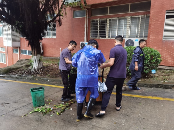 党员突击队打头阵。机关党委牵头组建“党员突击队”,党员亮身份、当先锋,服从统一调度,奔赴抢险救灾最需要的地方。狂风暴雨造成校园内树木倒伏,路面积水,党员突击队队员们全力出动,迅速赶往现场,及时协助清除路面障碍,疏通路面积水,确保校园主干道的正常通行。突击队队员们化身“外卖小哥”,无惧风雨,深入一线,在注意自身安全的同时,奔波于学生宿舍楼之间,确保622名暑期留校的学生能准时吃上可口的饭菜,并及时叮嘱留校学生做好安全防范台风工作。