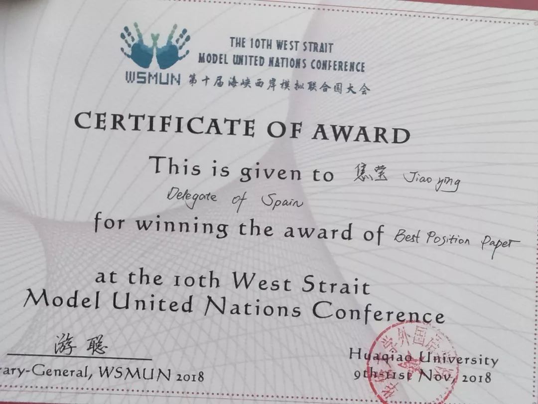 3天的会期时间紧张,随着会期接近尾声,我们这次的模联之旅也告一段落。各大委员会进行了自己的合照。17级特殊教育专业焦莹也荣幸收获Best Pesition Paper这一荣誉。