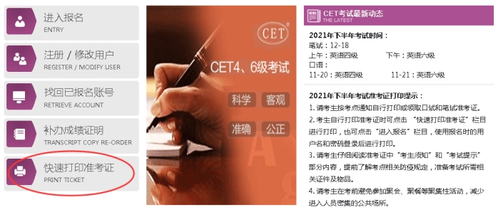 2021年12月全国大学英语四六级考试于12月18日进行,凡成功报考本次四六级考试者,可于12月1日9时登录全国大学英语四、六级考试报名网站 打印准考证。详细打印流程如下: