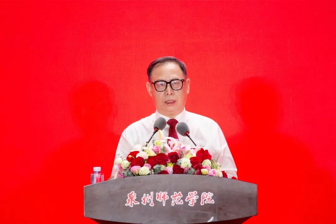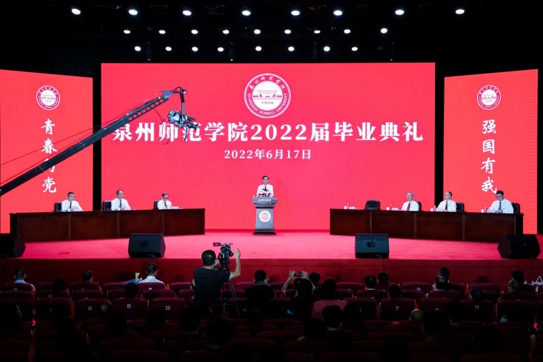 校长屈广清在致辞中祝贺2022届毕业生,并向培养和关心毕业生成长成才的师长、亲人和社会各界致以最诚挚的感谢和最崇高的敬意。他列举了本届毕业生在竞赛、考研等方面取得的成绩,回顾了四年来学校建设发展取得的成就以及泉州新冠肺炎疫情期间师生共同抗疫的点滴。屈广清以“行远自迩再出发 笃行不怠赢未来”为主题,用叶宏坚、吴季怀和蔡崇达三位学长的成长经历勉励毕业生:一要初心如磐、赓续前行。无论什么职业,无论处在何方,要不忘初心,永葆本色。二要砥砺深耕、履践致远。专注内心的热爱,默默坚守,倾力钻研,久久为功,终能抵达理想的未来。三要奋楫笃行、扬帆筑梦。立足人生主赛场,不断探索,开启一个个时间“盲盒”,抢占“快车道”,跑出“加速度”。