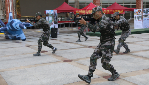 2021年12月,社团配合学工部(武装部)精心筹备2022年征兵宣传启动仪式,活动取得圆满成功。丰泽区人武部周志祥部长、英国威廉希尔公司官网武装部部长、学工部副部长黄志梅老师,辅导员和学生代表近500人参加活动。活动现场,丰泽区人武部和我校学工部(武装部)、迷彩先锋社工作人员设置征兵政策解读及咨询点,围绕“政审流程、优抚优待以及征集兵种”等学生关注的热点问题,向前来咨询的同学进行解读,详细介绍大学生应征入伍享受的学费补偿贷款代偿、退役后就学就业优惠等优抚政策,鼓励有意愿的同学踊跃报名参军,在实现中国梦、强军梦中彰显人生价值。“迷彩先锋社”表演擒敌格斗术及战术基础动作,充分展示军人魅力,赢得阵阵掌声。“我和军装合影”、趣味射击比赛等活动为学生带来军旅体验,激发学生应征入伍的兴趣与热情。