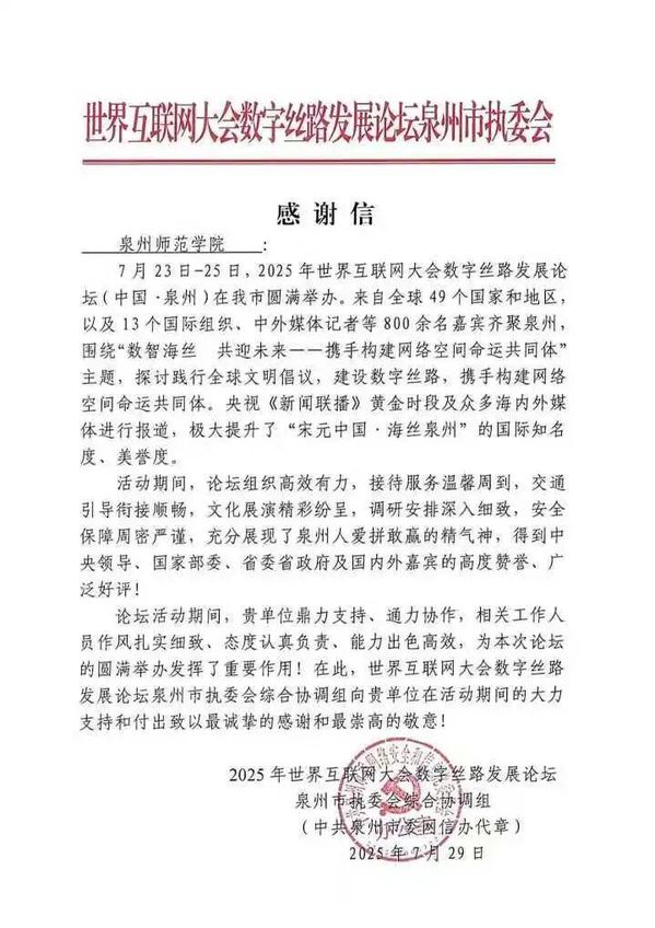 近日,我校收到2025年世界互联网大会数字丝路发展论坛泉州市执委会发来的感谢信。信中指出,论坛活动期间,学校鼎力支持、通力协作,相关工作人员作风扎实细致、态度认真负责、能力出色高效,为本次论坛的圆满举办发挥了重要作用。