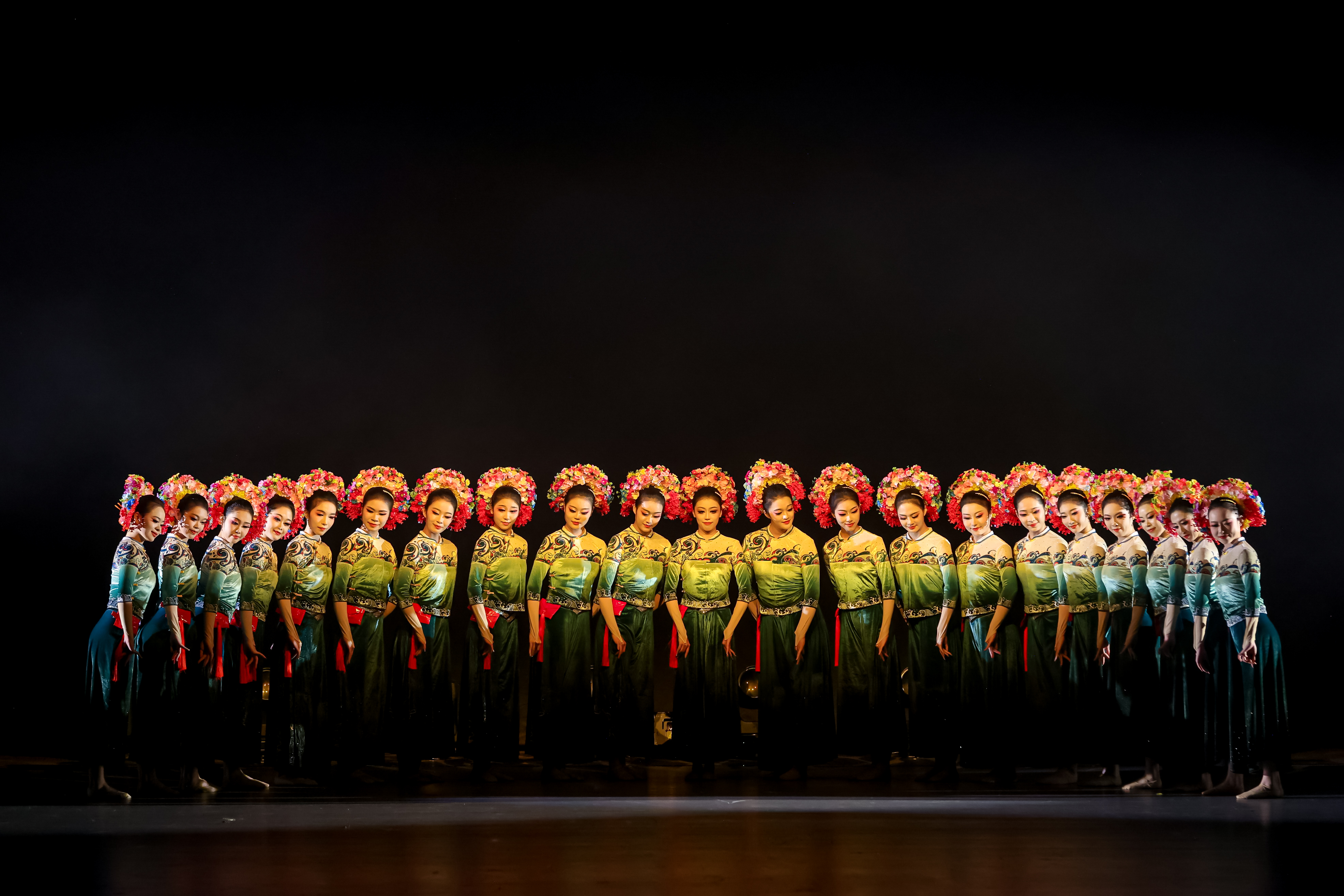 舞蹈《簪花围》的灵感源自闽南蟳埔女。借助“簪花围”这个承载渔家人情感和记忆的文化符号,运用“缠”与“望”的舞蹈语言,细腻刻画蟳埔女期盼亲人归航的深切情感,进而将思亲之情升华为两岸同根同源、血脉相连的民族情感,传递出盼望团圆的美好愿景。整个作品以海丝风情和闽越文化为底色,生动展现“海风千万里,花开四季插满头”的独特风情,具有浓郁的文化底蕴与艺术感染力。
