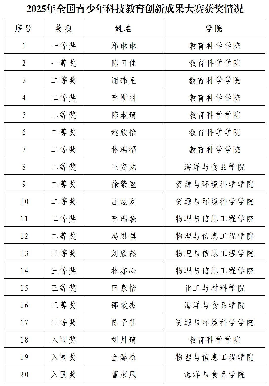 近日,2025年全国青少年科技教育创新成果大赛在武汉举行。经过激烈角逐,我校参赛选手斩获一等奖2项、二等奖10项、三等奖5项、入围奖3项。