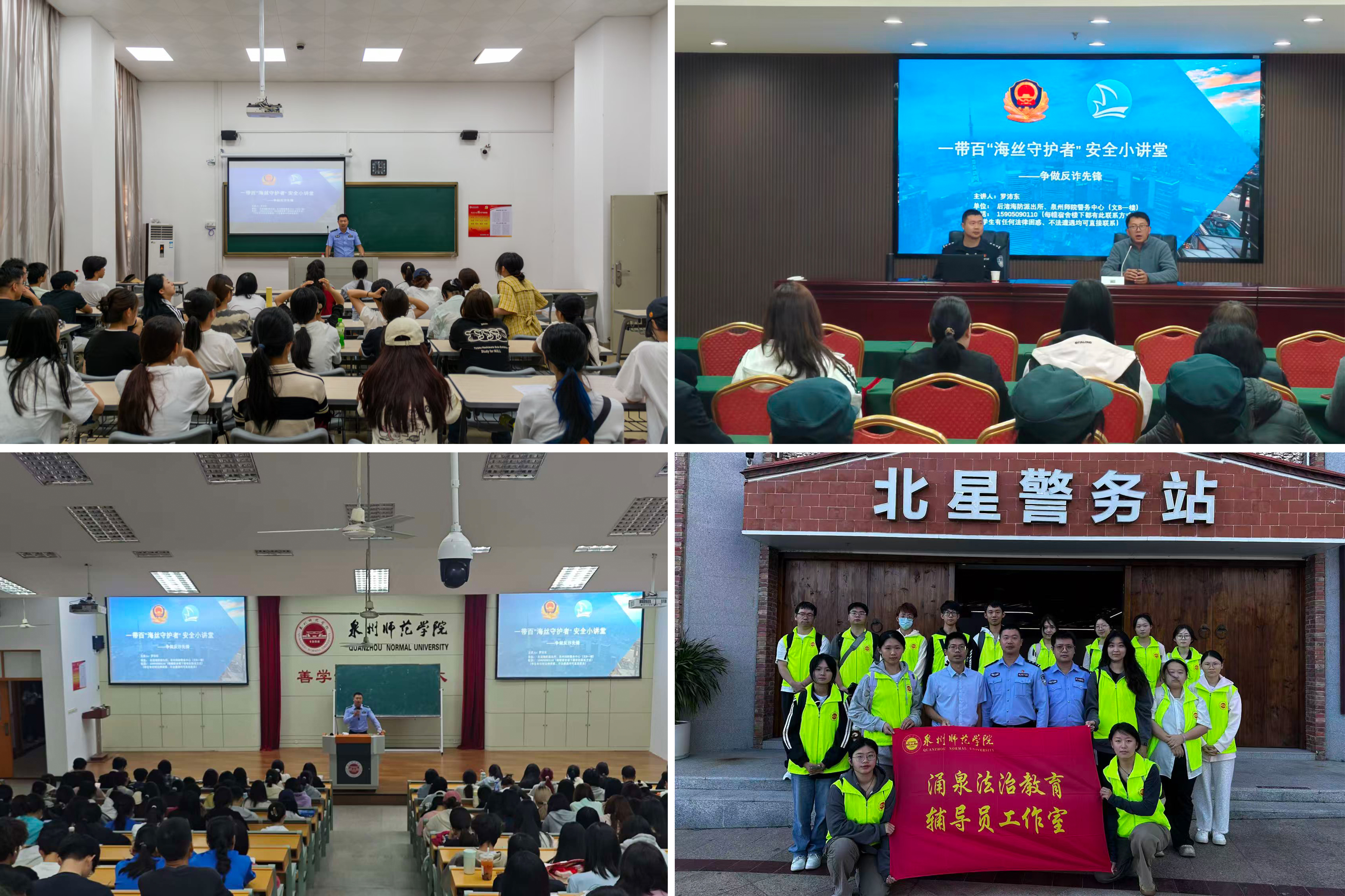 后渚派出所派驻15名民警挂联各二级院系,协助学校建立由332名学生骨干组成的“海丝守护者”队伍,以“一带百”安全小讲坛为主要形式,组织安全宣讲、知识竞答和主题班会等活动,形成安全宣传教育“从学生中来,到学生中去”。团队自成立以来,持续深入推进社区民警联动学生安全法制宣讲员、安全信息员等,先后走进15个院系和46个班级,开展各类安全专题宣讲与主题班会等60余场。通过“海丝守护者”小程序、安全工作群和“平安校园”“清晖校卫”公众号等发布安全提示与预警信息356条。举办反诈宣传月启动仪式,组织师生前往北星警务站、泉州强戒所等开展安全专题社会实践和主题研讨,开展教职员工防范诈骗、消防安全等专题培训等10余场次,构筑“警校联动、师生联防”的校园安全防线。