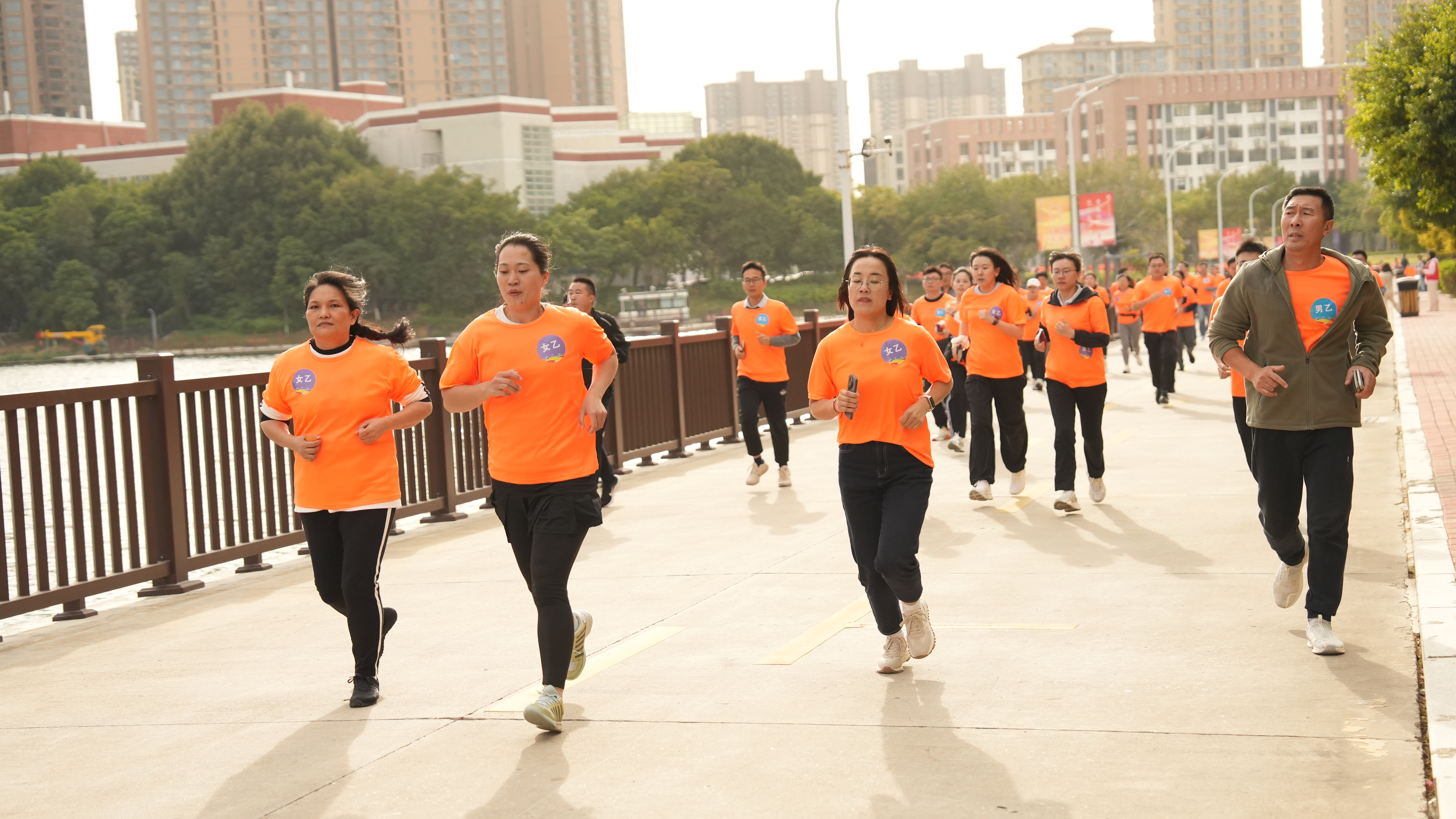 本次活动按年龄分为男甲、女甲、男乙、女乙四个组别。下午2:30,参赛教职工们统一身着橘红色T恤衫,齐聚中山广场,脸上洋溢着笑容,在专业教练的带领下进行热身运动,现场气氛热烈而有序。