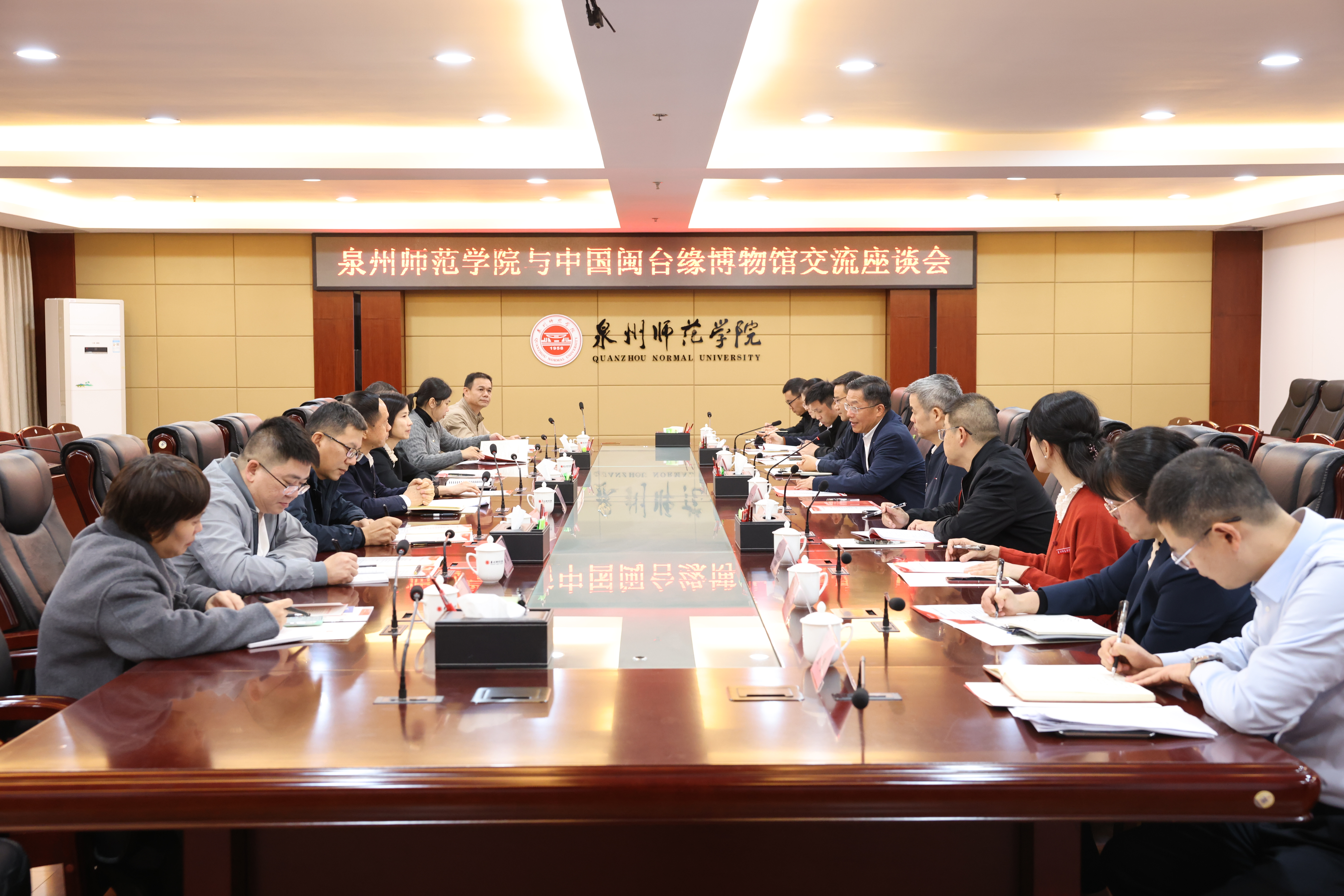 柯瑞清、陈昌萍代表学校,对陈璇、郑国防一行表示欢迎,介绍了学校建设发展情况及对台交流合作情况。他们指出,学校深耕泉州历史文化沃土,拥有深厚的人才、学科积淀,与中国闽台缘博物馆的馆藏资源、平台优势高度契合,合作空间广阔,希望双方进一步深化校馆文化传承创新与协同育人,更好地服务两岸融合发展。