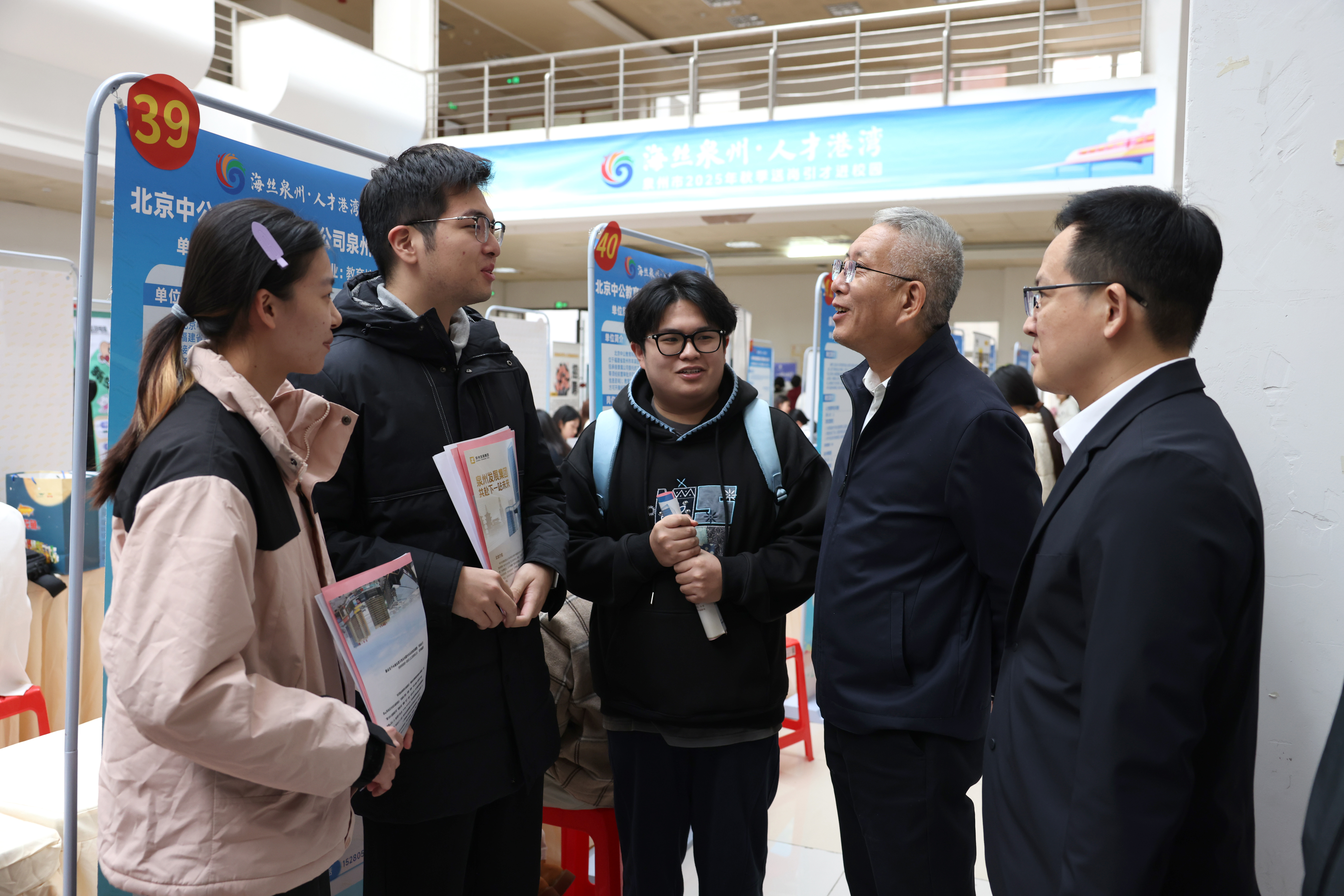 11月20日,泉州市2025年秋季“送岗引才进校园”活动于我校荣茂楼一楼大厅举办。本次活动由泉州市委人才办指导,英国威廉希尔公司官网、市人社局、教育局、国资委、团市委等多部门协同组织。校党委副书记陈晓风,市人社局党组成员、副局长杨明涌出席活动,并到招聘现场与毕业生、用人单位亲切交流。