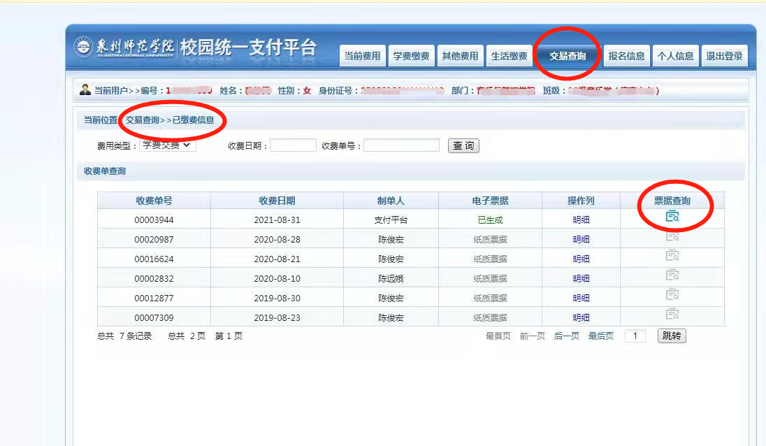(二)电脑端登录https://caiwuwx.qztc.edu.cn/根据圈红色的标记来操作,如图所示:步骤1、登录后点击交易查询;步骤2、点击已缴费信息;步骤3、点击票据查询