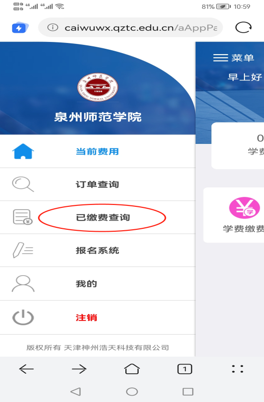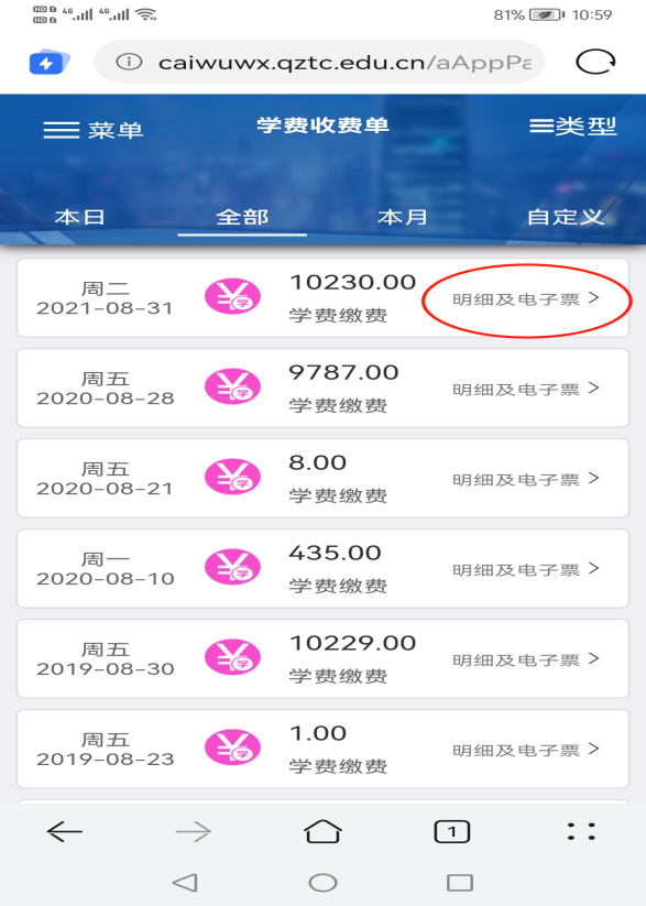 (一)手机端登录https://caiwuwx.qztc.edu.cn/ 根据标记操作,如图所示:步骤①登录后点击菜单;步骤②点击已缴款查询;步骤③点击明细及电子票;步骤④点击查询。