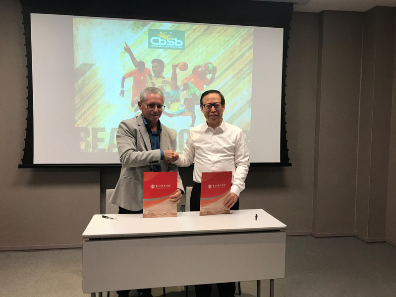 Qu Guangqing signs a cooperation memo with Brazilian Beach Soccer Association.