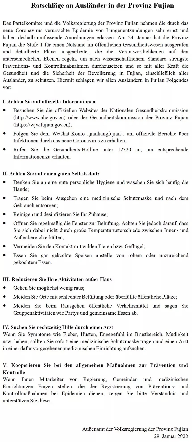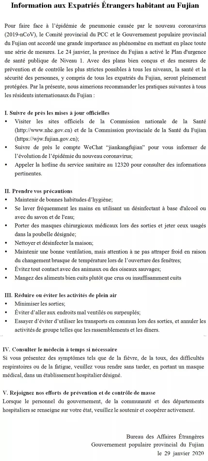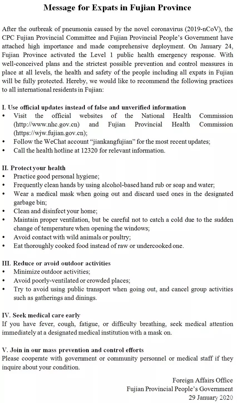 针对近期新型冠状病毒感染的肺炎疫情,福建省委、省政府高度重视,统一部署,已于1月24日启动了重大突发公共卫生事件一级响应,制定周密方案,层层压实责任,确保最严格的科学防控措施落实到位,全力维护人民群众包括在闽外籍人士健康安全。在此,我办谨向在闽外籍人士提出如下倡议: