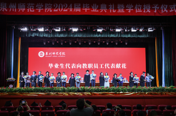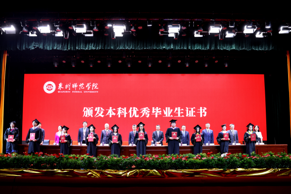 During the ceremony, Ke Ruiqing presented a commemorative plaque to alumni Lin Yumei. Vice President Xiahou Jianbing read the official document on graduation and degree conferral for the Class of 2024. Chen Xiaofeng, Deputy Party Secretary of QNU, announced the recognition of outstanding graduates, with leaders and guests presenting honorary certificates to their representatives.