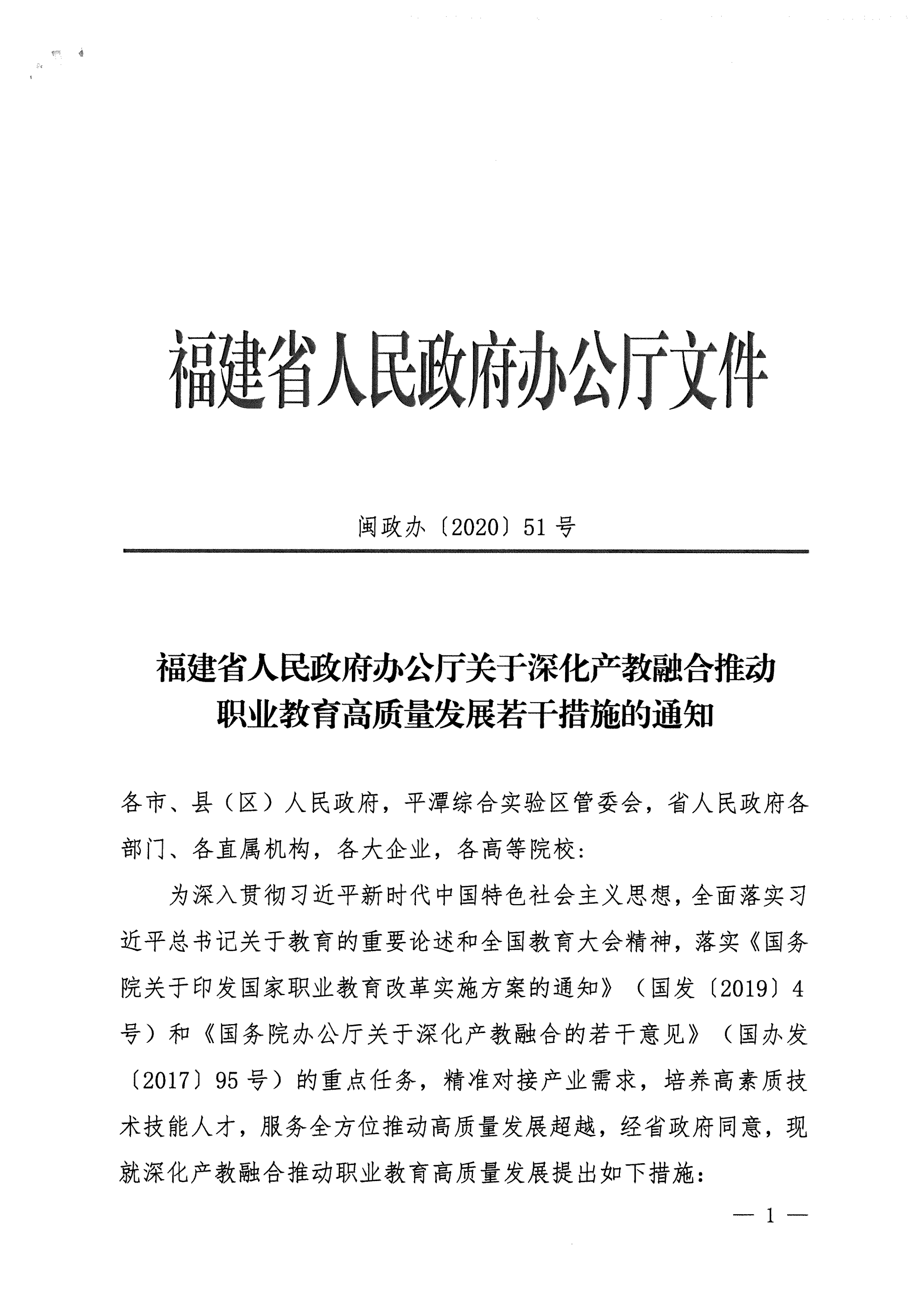 转发《福建省人民政府办公厅关于深化产教融合推动职业教育高质量发展若干措施的通知》