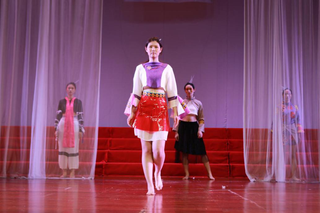 此次动态展在511日晚8点祖昌礼堂展示的作品包括服装、鞋类和箱包三个设计类别,融合了休闲、时尚、怀旧等不同风格,同学们的设计作品很好地诠释了传统与现代,经典与流行、文化与时尚的完美结合,很多设计作品不再单纯注重服装的外在形式,而是注重衣服背后的社会意识和人文关怀。其中多套服装作品汲取我国传统文化元素,结合敦煌壁画的《丝路霓裳》,汲取海上丝绸之路文化的《系》,运用了扎染、刺绣的《复》,灵感来源于西藏红墙的《第三极》等。作品《葳蕤》通过将旧物利用,环保的理念与设计相结合,以环保为基础,通过面料设计的形式进行创新,赋予服装新的活力。两用式背包既实用又美观,穿时可当外套时不穿时可当挎包,创意新奇,给观众留下了深刻印象。