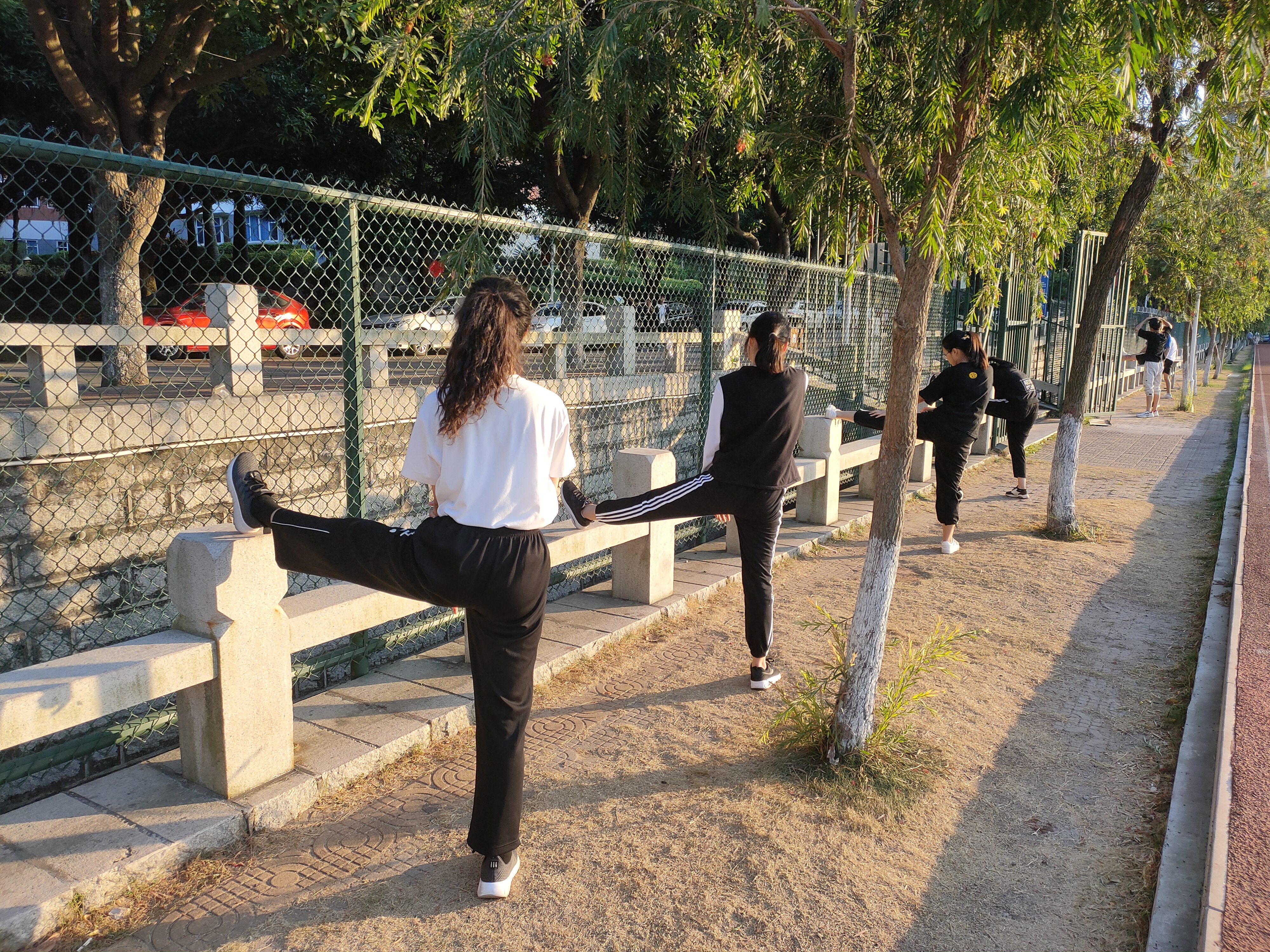 我院运动员于每日傍晚时分在田径场进行训练。训练开始前,运动员们听从教练的统一安排进行拉伸、高踢腿等热身运动,在进行了热身运动后,运动员们按照教练计划有条不紊的开展训练工作。