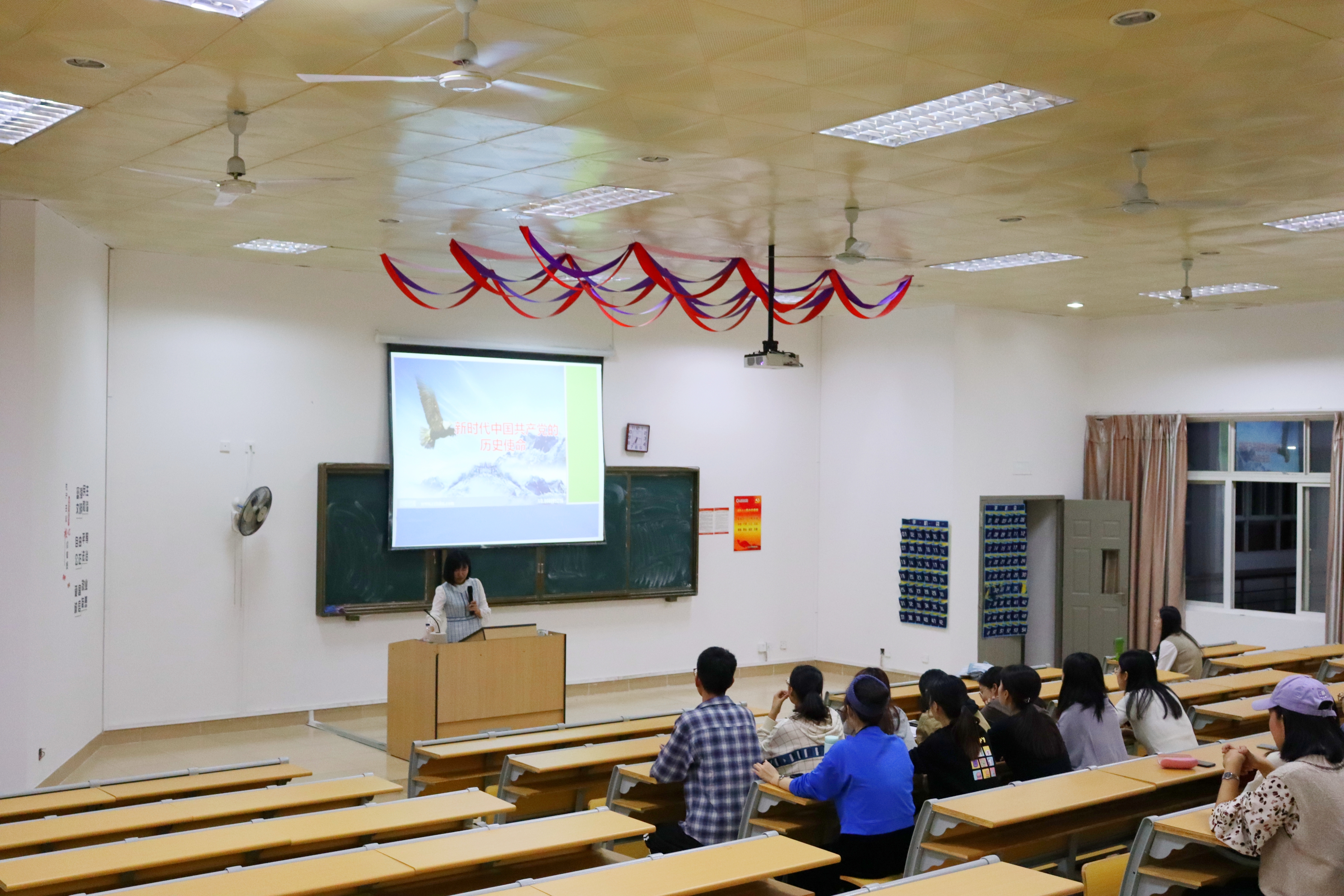 聂莹老师以“新时代中国共产党的历史使命”为主题,强调了习近平总书记在党的十九大报告中提出的“中国特色社会主义进入了新时代”这一新的历史方位,详细阐述了中华民族从站起来、富起来到强起来的历史性飞跃以及中国特色社会主义进入新时代的历史依据和现实依据。最后,聂老师以习近平总书记在十九大报告中提出的“四个伟大”来阐述新时代中国共产党的历史使命,强调伟大斗争扫清前行障碍、伟大工程锻造坚强领导核心、伟大事业宣示旗帜道路和伟大梦想彰显初心使命,号召全体党员要真正把党的十九大精神“学懂弄通做实”,为“四个伟大”而不懈努力。