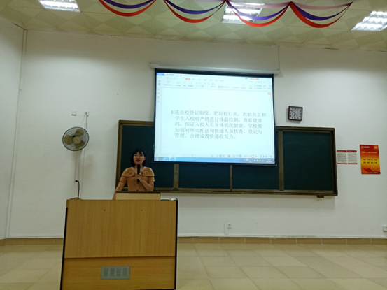 会上,聂莹老师传达学校、学院关于疫情常态化防控的会议精神,强调疫情常态化防控的重要性,要求全院学生要引起重视,增强疫情防控意识,加强心理疏导,筑牢防疫心理防线。程钟洛老师围绕疫情常态化下学生的日常管理、进出校登记制度、教室卫生管理、疫情处置流程等方面进行阐述,提醒同学们要遵守学校疫情防控制度要求,做好宿舍卫生,提升个人免疫力。