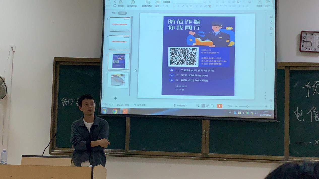 会上,辅导员老师首先介绍了电信诈骗案件的特征及类型,让同学们对电信诈骗手法有了初步的了解。其次,辅导员老师从近期发生的几起校园诈骗案出发,结合实例、生动形象,帮助同学们进一步加深对电信诈骗的认识,增强安全防范意识。最后,辅导员老师要求同学们关注“金钟罩”公众号,学习识骗防骗技巧,树立理性的消费观念,规避诈骗风险。