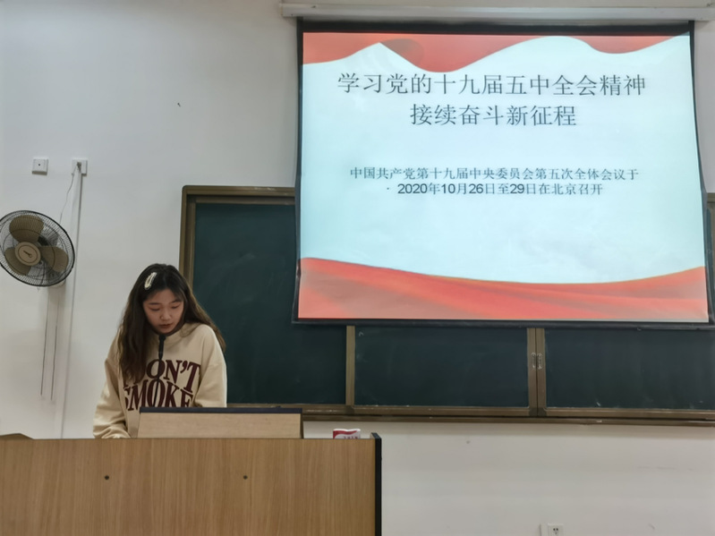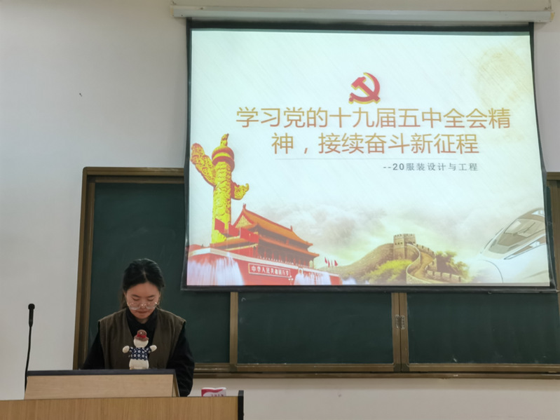 20服设班以图文结合的方式,向同学们介绍了学习党的十九届五中全会精神的重要意义,并组织同学观看了党的十九届五中全会的相关视频,让同学们对中国未来的发展方向及发展蓝图有了更直观的感受。20服工班则详细地学习了“十四五”规划和二〇三五年远景目标,引导同学们全面深入地了解党和国家为实现社会主义现代化目标所做的部署和规划,让同学们能够将党的十九届五中全会精神贯彻落实于个人的学习与生活之中。