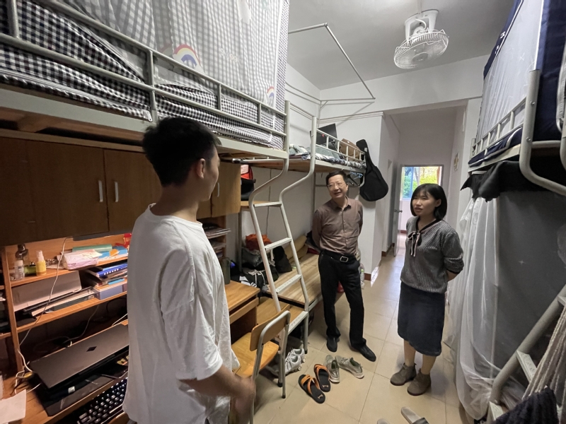 为更好地推动学校党委关于开展党史学习教育和“再学习、再调研、再落实”活动,4月30日下午,学院党委书记张玉武带领学工办主任聂莹、辅导员程钟洛和陈灿辉深入学生宿舍,开展五一节前夕学生宿舍走访工作。
