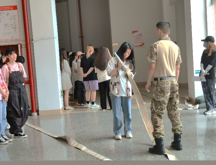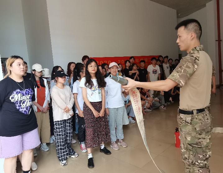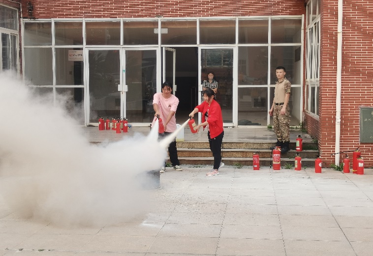 为模拟真实情景,本次演练场地爱约楼六层使用消防烟雾。全体演练学生均严肃对待,学院老师和教官迅速就位,同学们弯腰猫步,用湿毛巾捂住口鼻,沿着学院指定楼梯口靠墙快速有序地撤离教学楼,到达指定避难场所爱约楼一层的空地处。到达指定避难场所后,在学院老师和教官的指挥下,各个班级有序清点人数,并逐级进行汇报,确保全体师生的安全。而后,教官向同学们真实演示灭火器是如何扑灭火源,各班委依次上前学习使用。