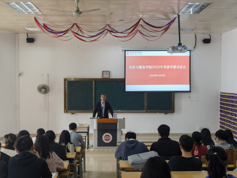 12月8日中午,纺织与服装学院在荣助梯教212举行2022年考研考前动员会。全体考研学生参加,院长邱夷平主讲,党委书记黄国波主持。