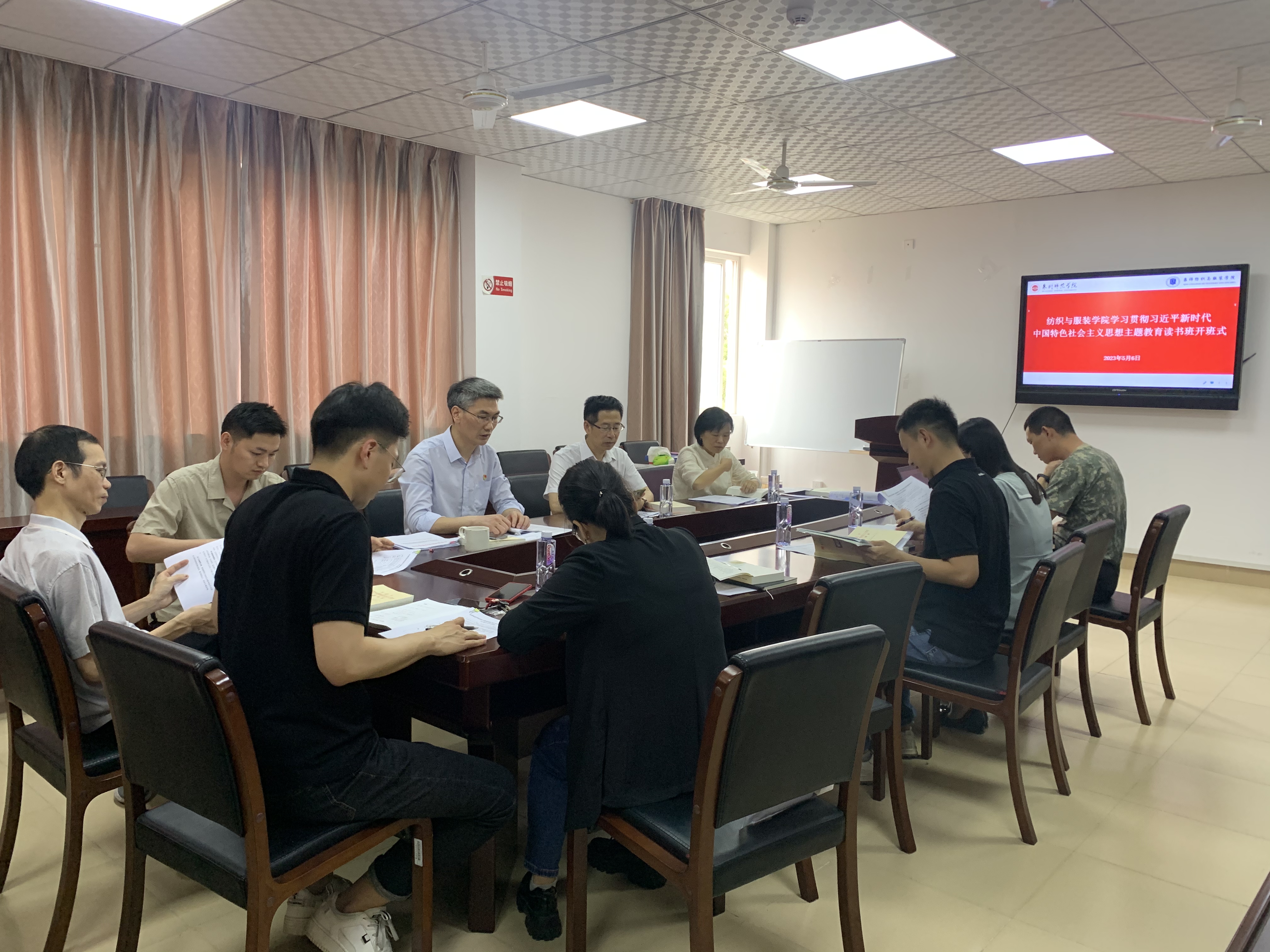 5月6日下午,纺织与服装学院学习贯彻习近平新时代中国特色社会主义思想主题教育读书班开班式在王爱约楼701会议室举行。学院党委书记、学习贯彻习近平新时代中国特色社会主义思想主题教育领导小组组长黄国波主持开班式并作动员。党委班子成员,各系(办)、党支部负责人以及全体辅导员参加会议。
