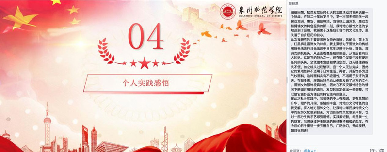 实践团成员单子涵表示:通过本次暑期社会实践,我真正切身走近了湄洲女、惠安女和蟳蜅女,了解她们的生活环境与传统习俗。渔女服饰文化是代代渔女勤劳奋斗的缩影,是闽南一道独特的民俗景观,值得我们去发扬和传承。作为新时代中国青年,应担当新时代新的文化使命。