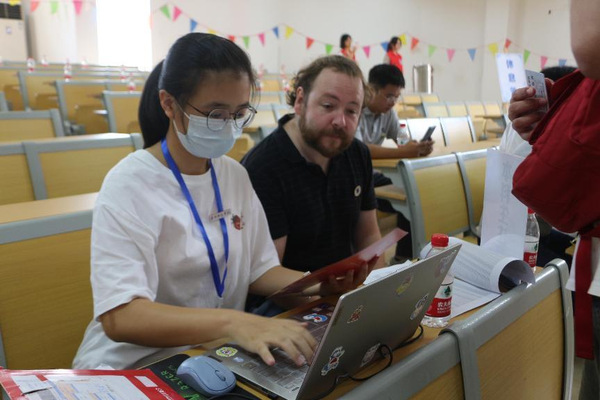 在荣助楼报到现场,学院领导,“三办”工作人员及部分青年教师、学生志愿者分工协作,密切配合,引导新生高效、便捷、有序地完成报到。