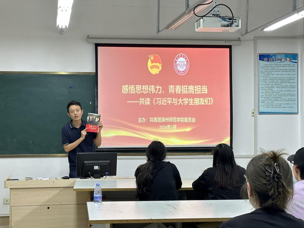 辅导员廖春霖带领同学们共读了《习近平与大学生朋友们》的部分内容,并对同学们提出了三点希望,一是希望同学们坚定理想信念,矢志艰苦奋斗,不负青春韶华;二是希望同学们在学期间多参加社会实践、志愿服务项目、专业实习等,在实践中学知识、长才干、强素质;三是希望同学们厚植家国情怀,到基层和人民中去建功立业,让青春之花绽放在祖国最需要的地方。
