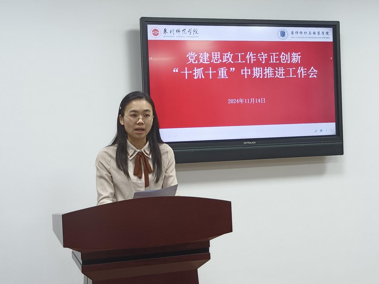 11月14日上午,纺织与服装学院在王爱约楼701会议室召开推进党建和思政工作守正创新“十抓十重”中期工作推进会,深入学习贯彻习近平总书记关于高校党的建设和思想政治工作的重要论述,研究推动党建思政质量创优提升。学院党委书记黄国波主持会议。党委委员、副院长徐海燕,党支部书记,各系(办)负责人,全体辅导员,学生干部代表参加。