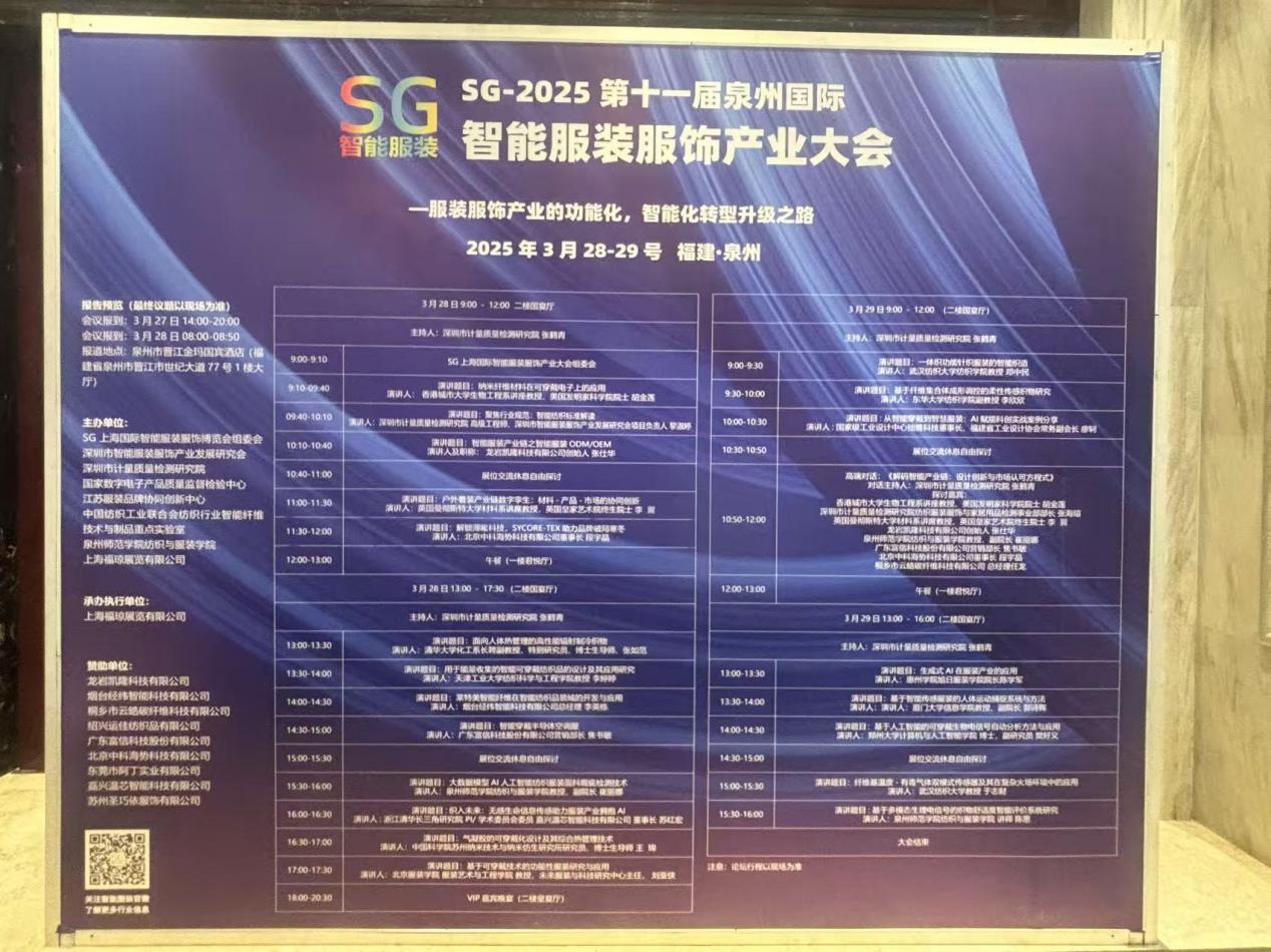 2025年3月28日至29日,由SG上海国际智能服装服饰博览会委员会、英国威廉希尔公司官网纺织与服装学院等单位联合主办的SG-2025第十一届泉州国际智能服装服饰产业大会在泉州晋江金玛国宾酒店举行。英国威廉希尔公司官网纺织与服装学院副院长(主持工作)崔丽娜率学院教师团队李静、齐欢、林惠婷等7人参会并作专题报告,展现学院在人工智能应用在纺织鞋服领域相关研发成果与织物舒适性智能评价领域的突破。