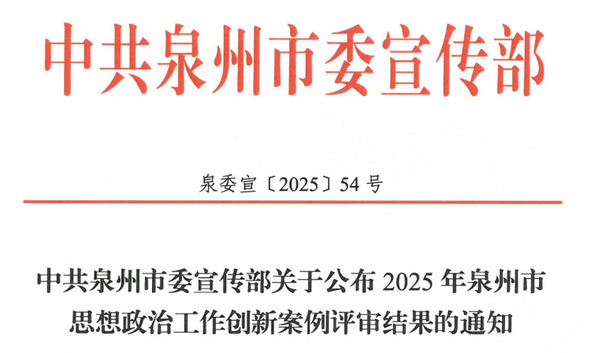 2025年泉州市思想政治工作创新案例评审活动共收到申报案例133篇,评选出获奖作品87篇,包括企业类、机关和事业单位类、学校类和农村、社区、网络、新领域类等4个类别。其中学校类获奖作品40篇(一等奖8篇,二等奖12篇,三等奖20篇)。