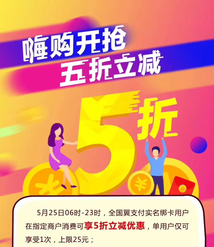 5月25日(本周五)使用翼支付到校内浅水湾商超(一店、二店)消费,畅享5折优惠,消费满50元立减25元