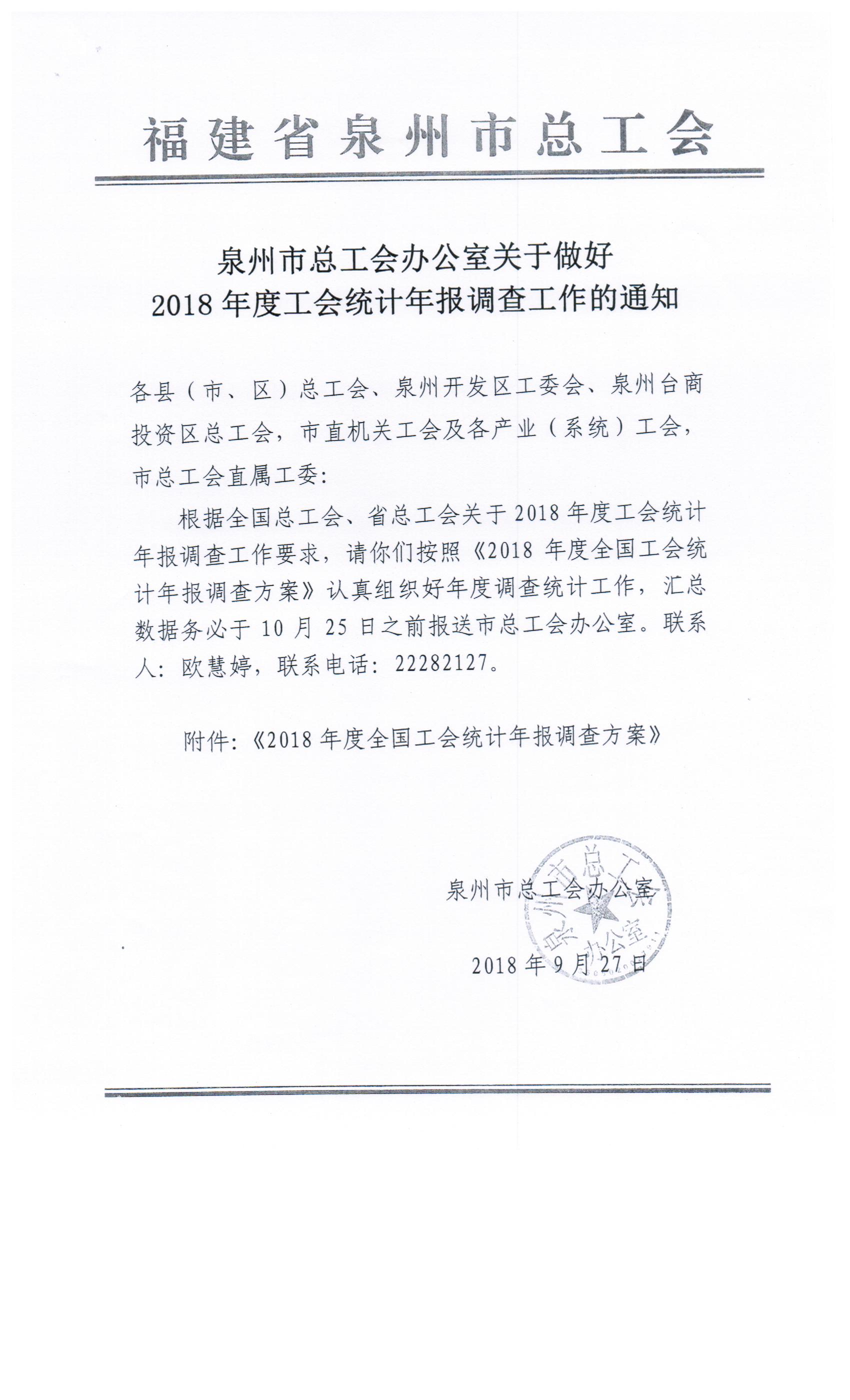 泉州市总工会办公室关于做好2018年度工会统计年报调查工作的通知