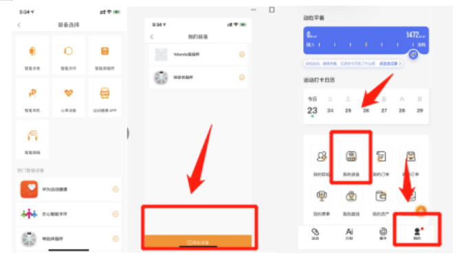 3.关于手环、手表同步数据步骤,进入【咪咕善跑APP】-点击【我的】-最下方【我的装备】-【添加装备】-选择需导入的手环、手表进行同步。