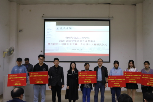 11月18日下午,我院在理工218教室举行2021年光电信息科学与工程专业奖学金暨学科竞赛获奖团队奖励金颁发仪式。院长、党委书记杨惠山,院党委副书记、纪委书记洪荣文,院党委副书记吴丽双,副院长陈木生、陈慧彬,科室负责人、辅导员、光电专业全体师生和学科竞赛获奖团队代表参加,本次活动由洪荣文主持。