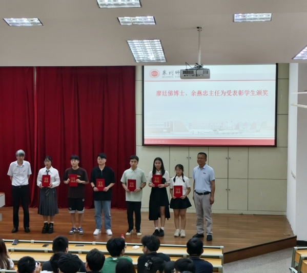 会上,光电工程系主任余燕忠宣读表彰通报,并与光子技术研究院名誉院长廖廷俤为考研学生颁奖。