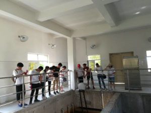 实践队来到污水管网公司,厂长和兰经理向我们介绍了一级A类排放的污水处理工序,点明了该污水处理厂的特色,并带领我们参观了污水处理和监控设备。最后,取处理后水样。