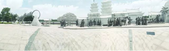 长达120米的东亚组雕,最精彩的是,跟平常单面雕塑不同,这组雕塑还借鉴了“双面绣”的灵感。其中,正面分别表现了听涛、飞天、诗文、双塔下奏唱南音、丝绸交易和瓷器交易、清净寺外香料珠宝石交易和文化交流、商人进城、使团到港、商舶装卸货、货物盘点和启航等场景和意象。背面则是航行、海市、亲人重逢、喜迎客商、提线木偶表演、观赏花灯、抚琴等场景和意象。