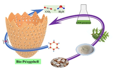 生物纳米课题组成员以具有天然孔道和分层结构的废弃蛋壳为载体,利用植物提取液作为还原剂和保护剂,通过植物还原法制备了鸡蛋壳负载的Pt催化剂(图1)。该催化剂具有多孔的结构、大的比表面积、好的贵金属分散和稳定能力,且其载体廉价易得,催化剂制备条件温和、绿色无污染,将其应用于VOCs催化氧化研究,具有优异的催化活性和稳定性,且通过DFT理论计算探究了其催化反应机理。该材料展示出比单一组份材料更优异的性能,是一类新型的VOCs催化剂材料,将可能在环保领域发挥重要用途,相关论文发表于ACS Applied Materials & Interfaces (中科院一区),英国威廉希尔公司官网化工与材料学院为第一单位。